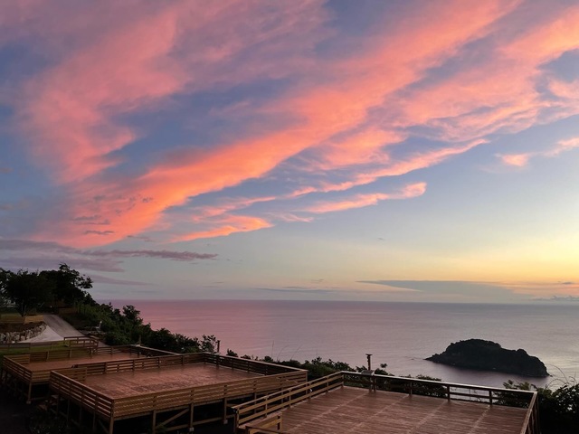 海に面した高台に整備されたキャンプ場。デッキサイトとグラウンドサイトがあり、駿河湾を一望し、海に沈む美しい夕日を見ることができる。ウッドデッキ用のペグも無料で貸し出しているので、テントも普通に設営できる。