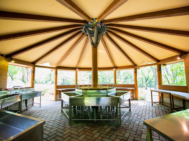 管理棟、サニタリー棟、炊事棟、水洗トイレ、温水シャワー、ランドリー、自動販売機、売店、多目的広場ほか